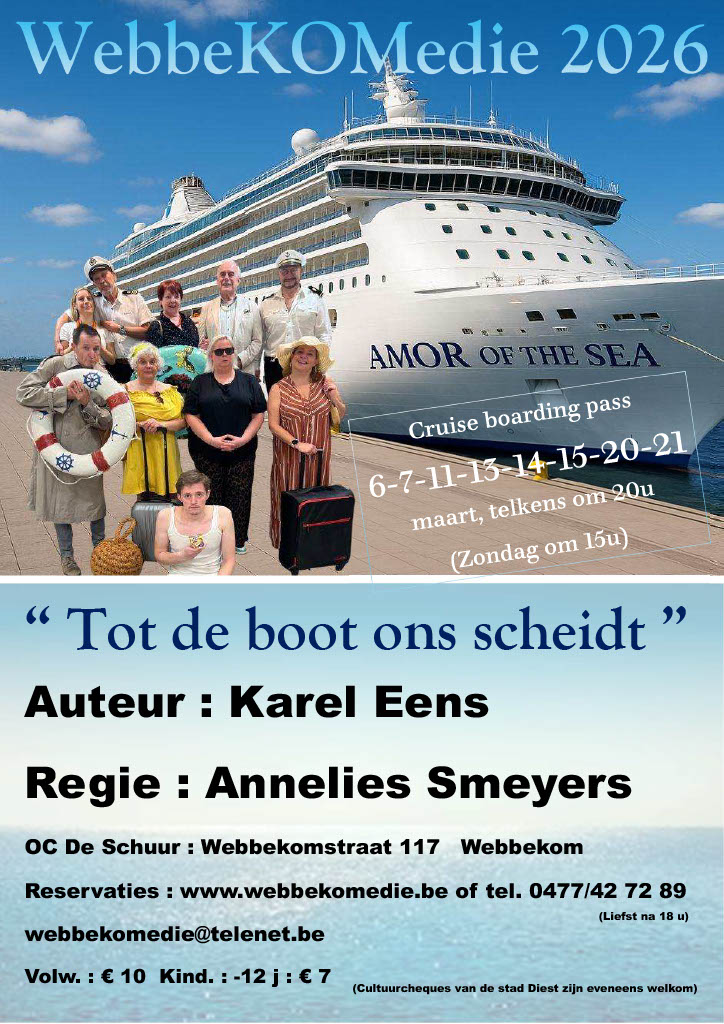 Reservaties zijn mogelijk via onze website www.webbekomedie.be of telefonisch op het nummer 0477/42 72 89 (liefst na 18u) en starten op